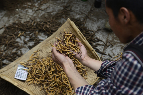 在中国华南一家杂货店入口附近的一个货摊上,人们可以看到精心排列的干货。靠近一点,你会看到它们是一英寸长的死“毛虫”,茎从其头部生长出来。它们生长在西藏和喜马拉雅山脉,这些茎是真菌,确切地说叫冬虫夏草菌,它们寄生于虫子身上,在虫子死亡后从其头部长出来。